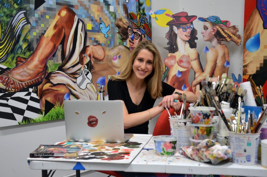 Brooklyn based artist, Allison Zuckerman is the DJ of the art world – cool, in control and mixes like a master or should we say, she mixes the masters. It’s all about reworking as she merges traditional artworks with her own, through collage and paint.